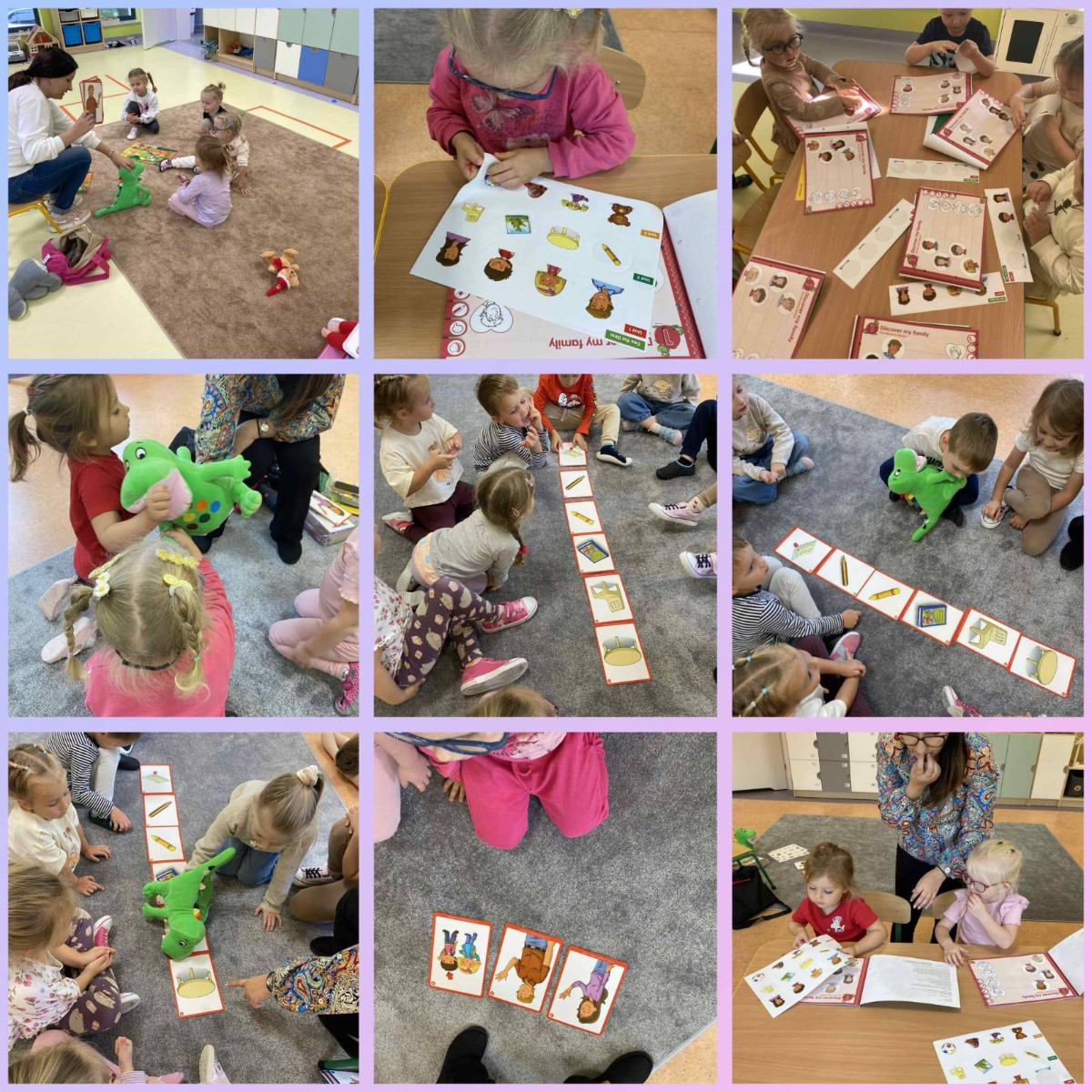 - Język angielski: piosenki, gry językowe i kartoniki tematyczne, wprowadzanie podstawowych zwrotów i słówek.