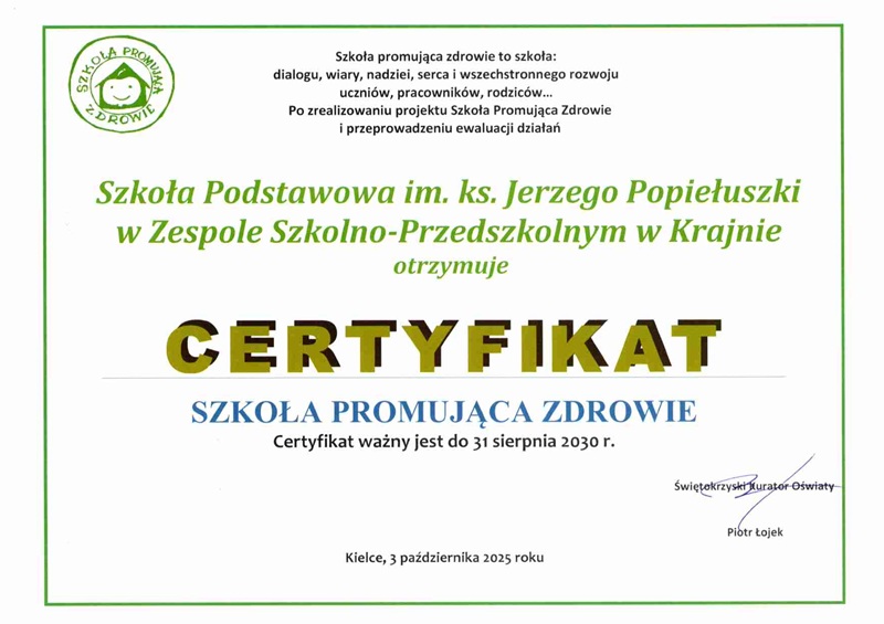 Nasza szkoła po raz drugi uzyskała certyfikat „Szkoła Promująca Zdrowie”. Uroczyste wręczenie certyfikatów odbyło się 3 października 2025r. w Busku-Zdroju z udziałem przedstawicieli Kuratorium Oświaty w Kielcach oraz władz samorządowych. Otrzymane wyróżnienie jest potwierdzeniem wieloletnich działań naszej społeczności na rzecz promocji zdrowego stylu życia, dbałości o dobrostan uczniów i nauczycieli oraz tworzenia przyjaznego, bezpiecznego środowiska szkolnego. Jesteśmy dumni, że nasze starania zostały docenione i motywują nas one do dalszej pracy na rzecz zdrowia i rozwoju całej społeczności szkolnej.