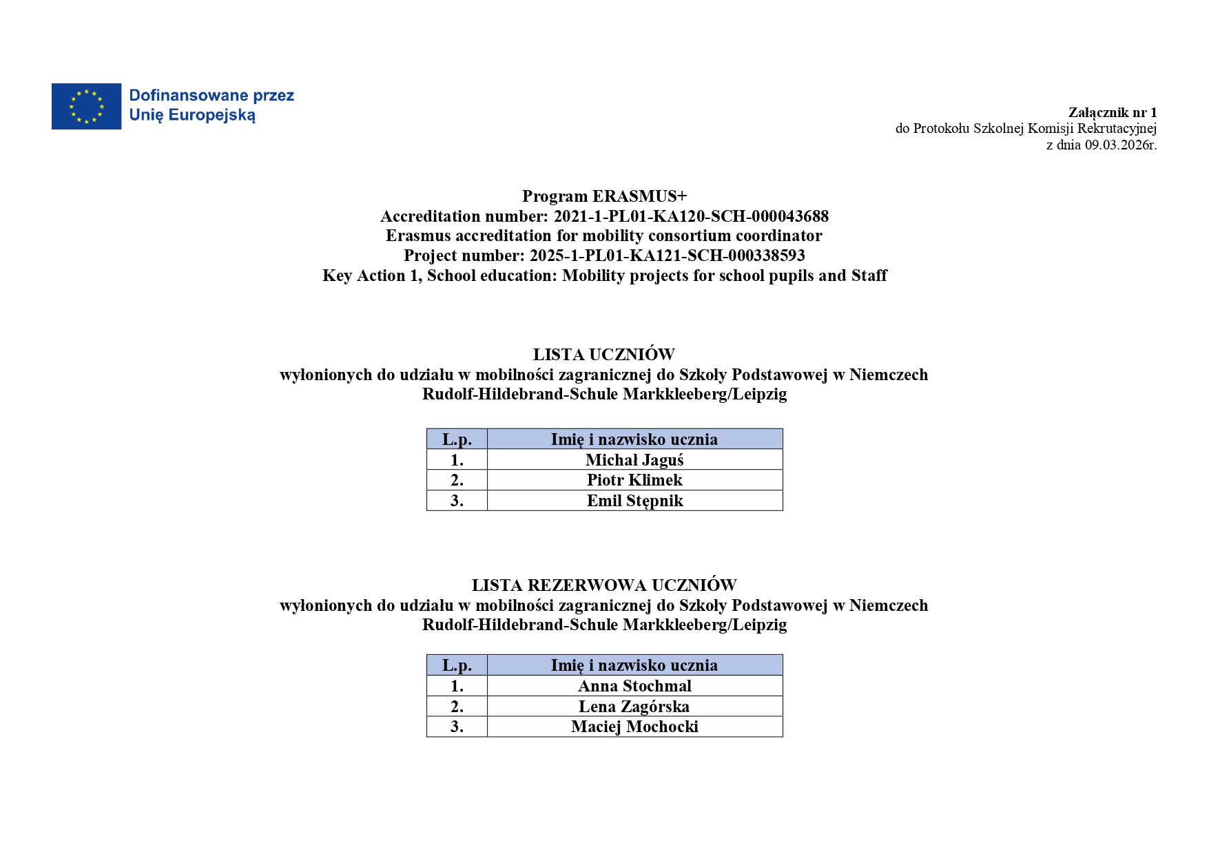 Lista uczniów wyłonionych do udziału w mobilności zagranicznej do Szkoły Podstawowej Slatina nad Bebravou na Słowacji oraz lista rezerwowa.